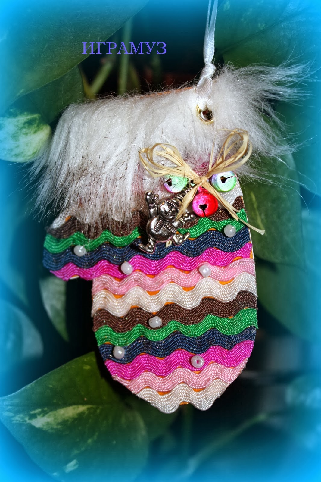 Варежка сделана из фигурной тесьмы - вьюнчик, мех искусственный, крупный бисер, подвеска - весёлый снеговик, переливающиеся бубенчики, бантик-травинка, люверс.